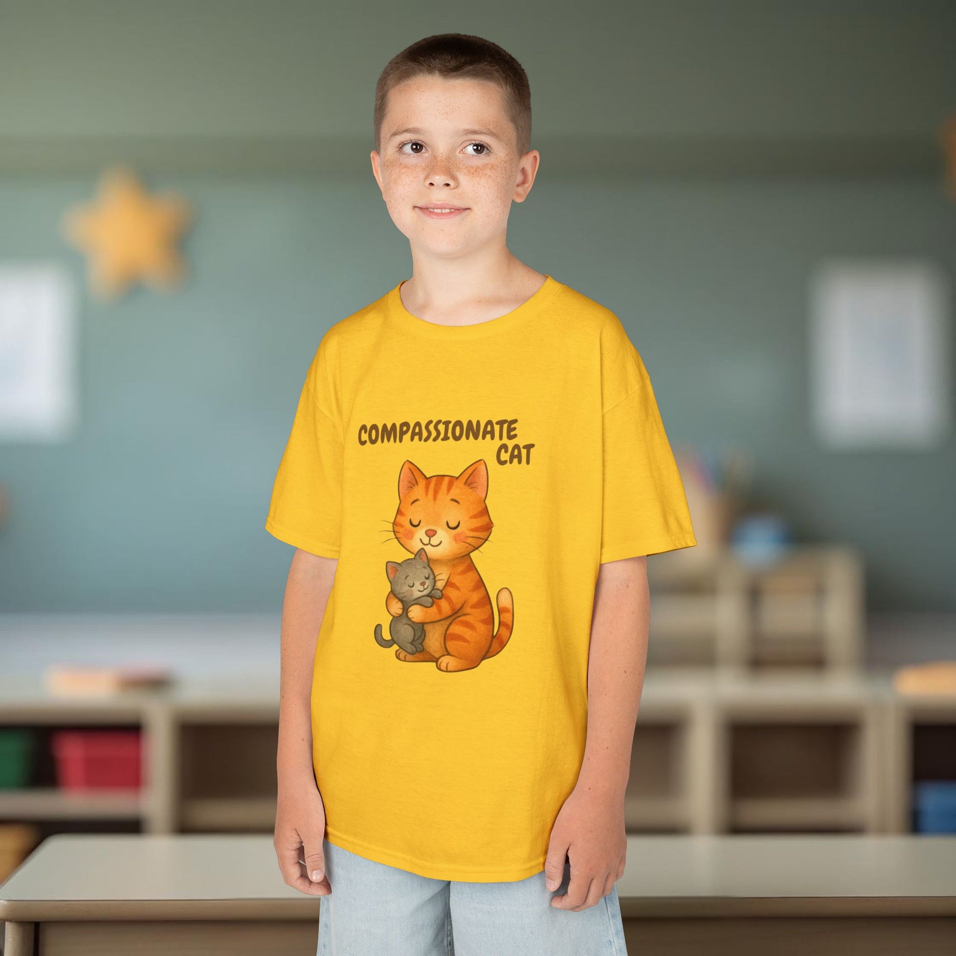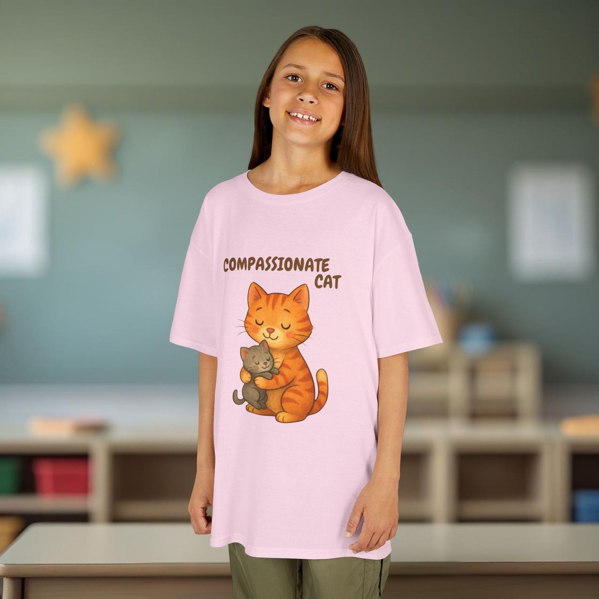 Share the warmth of kindness with our "Compassionate Cat" tee! Featuring a sweet cartoon cat gently hugging a smaller kitten, this shirt is a perfect fit for any child who is learning the importance of empathy and caring for others. It's a heartwarming and educational way to celebrate their compassionate nature, making it a great conversation starter about character and animals.