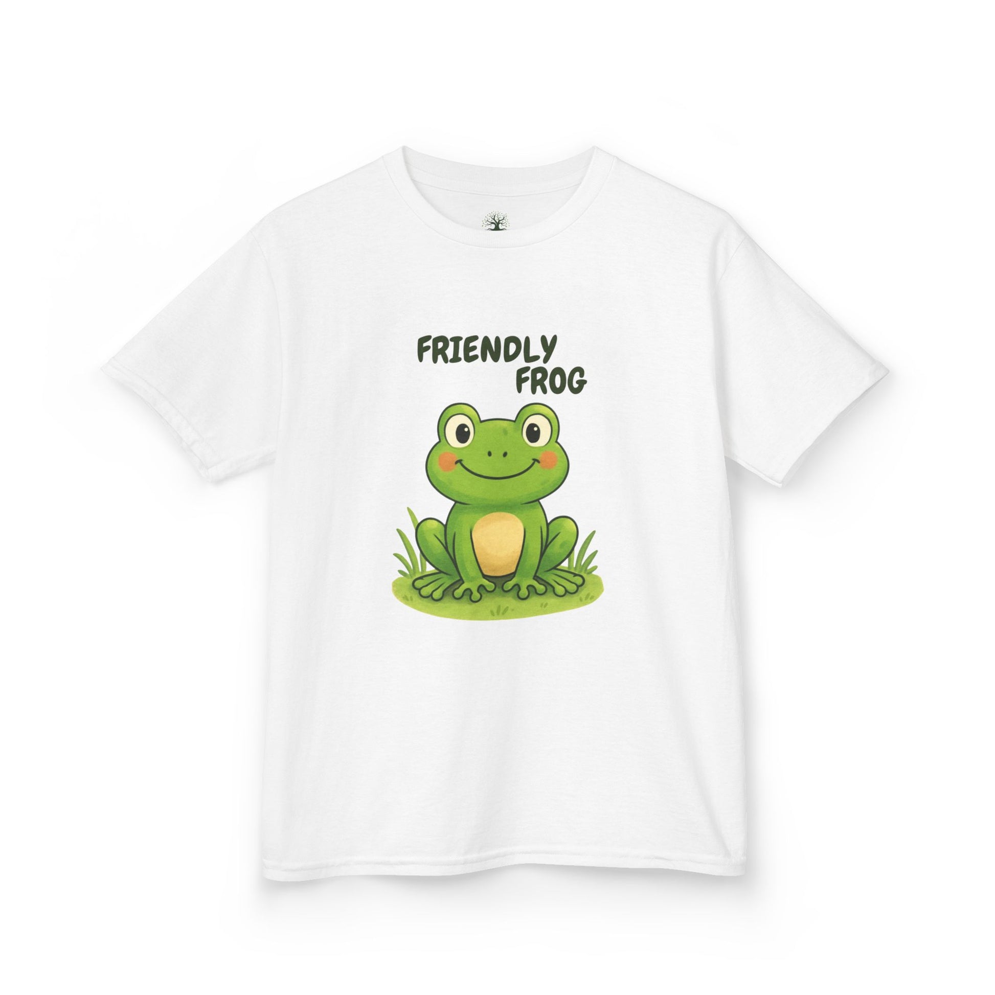 Hop into happiness with our "Friendly Frog" tee! Featuring a cheerful cartoon frog with a big smile, this shirt is a perfect fit for any little one who loves making friends and spreading joy. It's a sweet and inviting way to celebrate their friendly nature, making it a great conversation starter about character and animals.