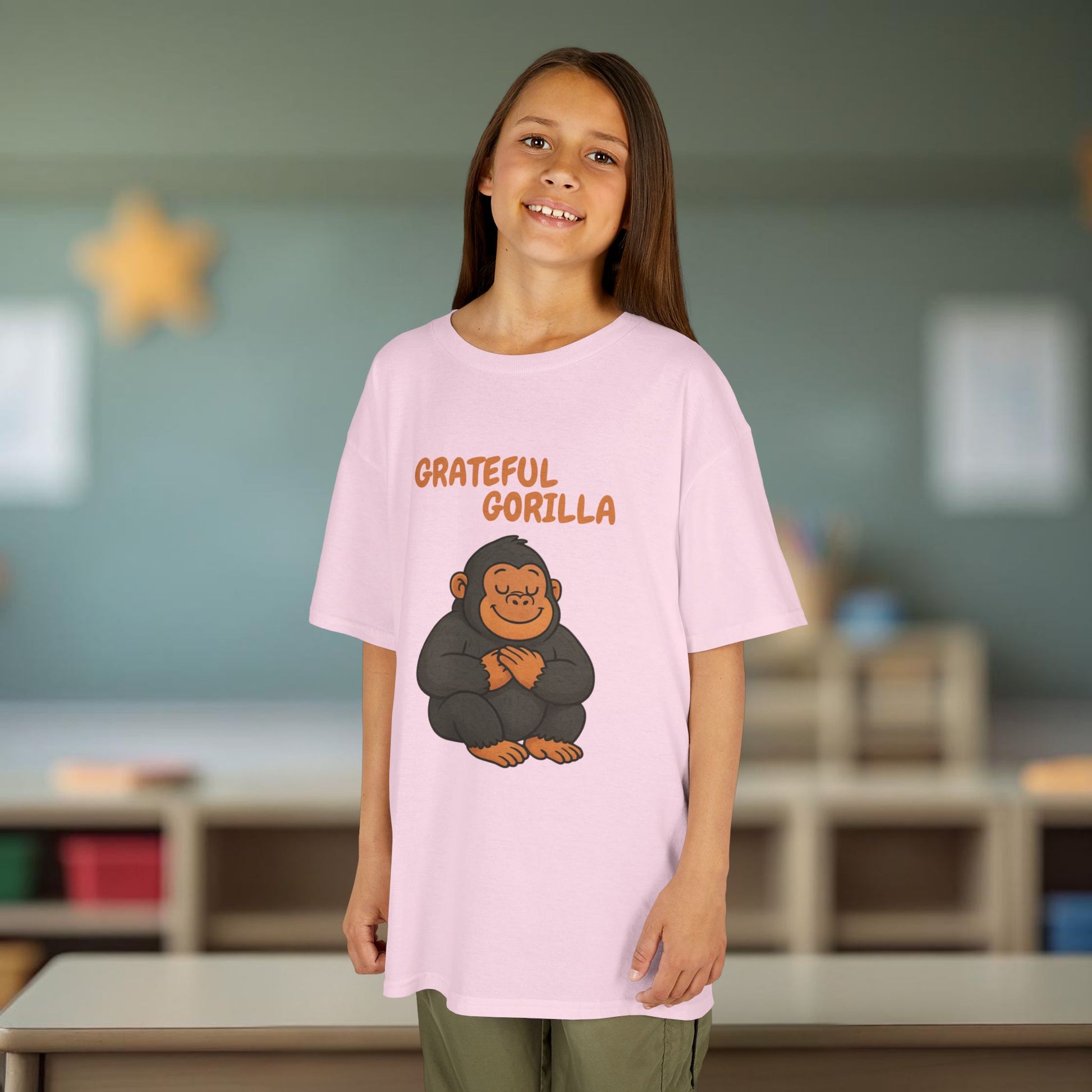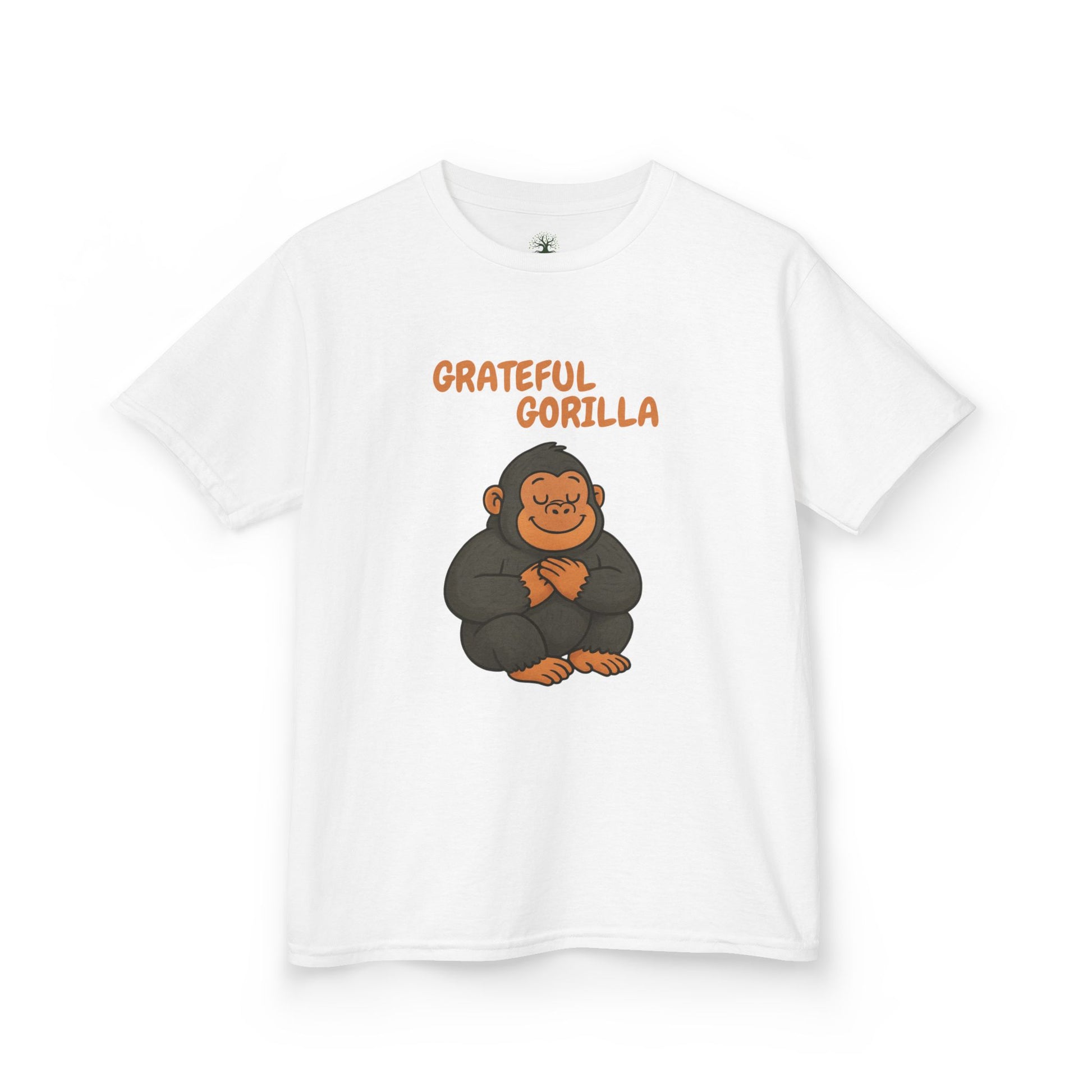 Inspire a thankful heart with our "Grateful Gorilla" tee! Featuring a peaceful cartoon gorilla with its hands clasped in gratitude, this shirt is a perfect fit for any little one who is learning the importance of appreciating the good things in their lives. It's a heartwarming and educational way to celebrate their thankful spirit, making it a great conversation starter about character and animals.