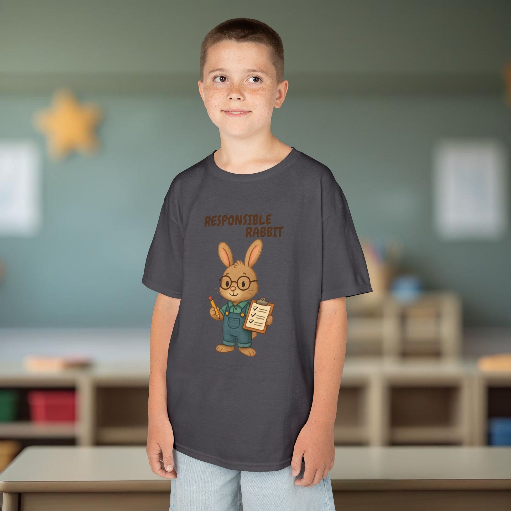 Meet our "Responsible Rabbit" tee, a playful and fun way to introduce your little one to the concept of being responsible—doing your part, fulfilling your duties, and keeping your promises! Featuring a cheerful cartoon rabbit wearing glasses and overalls while holding a clipboard and pencil, this shirt is a perfect fit for any child who is learning the importance of accountability and dedication. It's a sweet and educational way to celebrate their trustworthiness, making it a great conversation starter about character and animals.