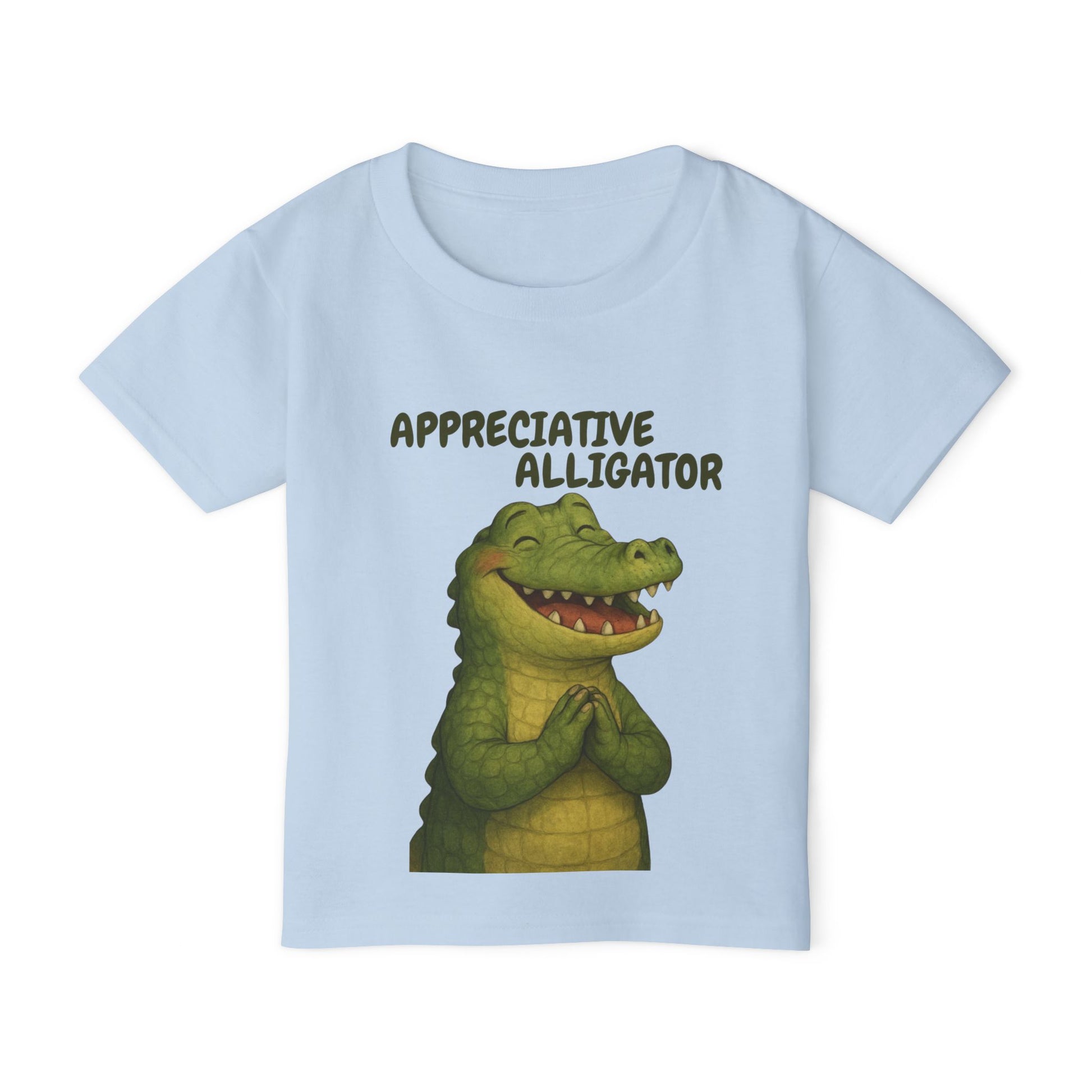 Spread the joy of gratitude with our "Appreciative Alligator" tee! Featuring a cheerful cartoon alligator with its hands clasped in a gesture of thanks, this shirt is a perfect fit for any child who is learning the importance of being thankful for the good things in their lives. It's a sweet and educational way to celebrate their thankful heart, making it a great conversation starter about character and animals.